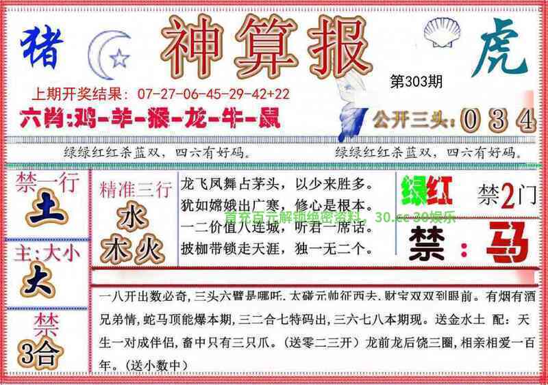 303期:七肖【猪牛羊鸡龙马虎】开:兔15错